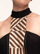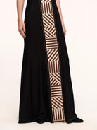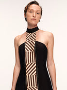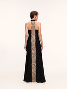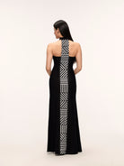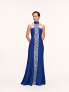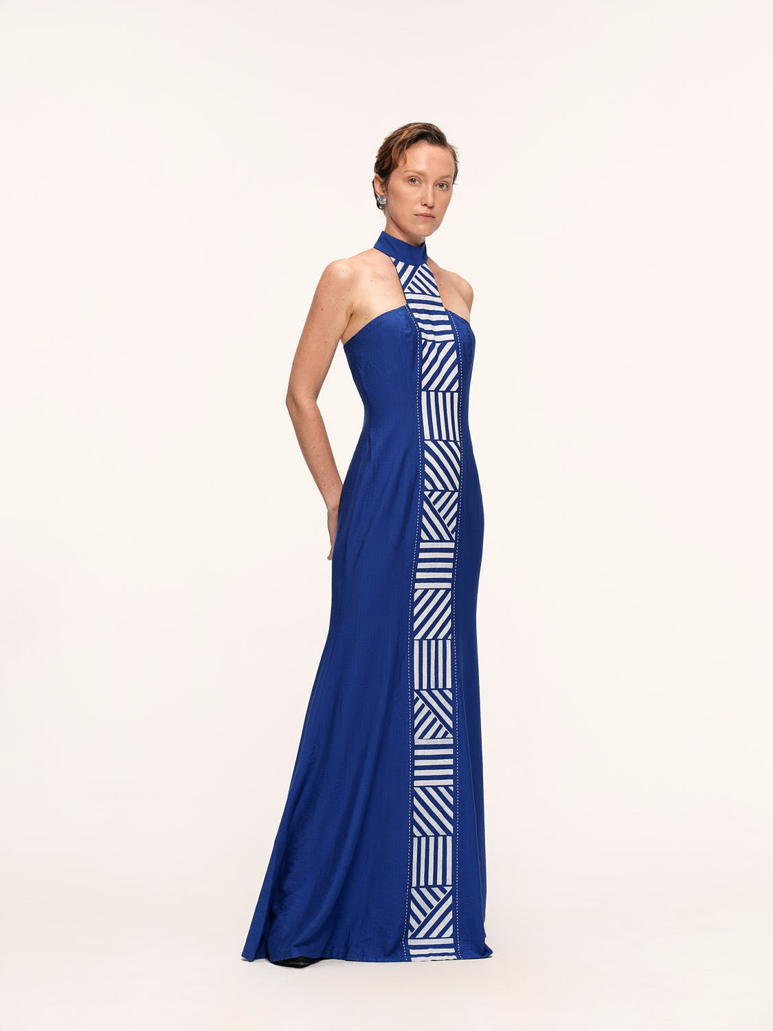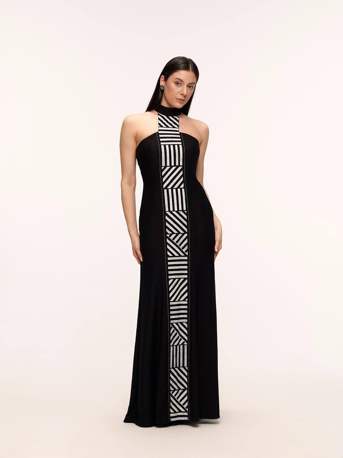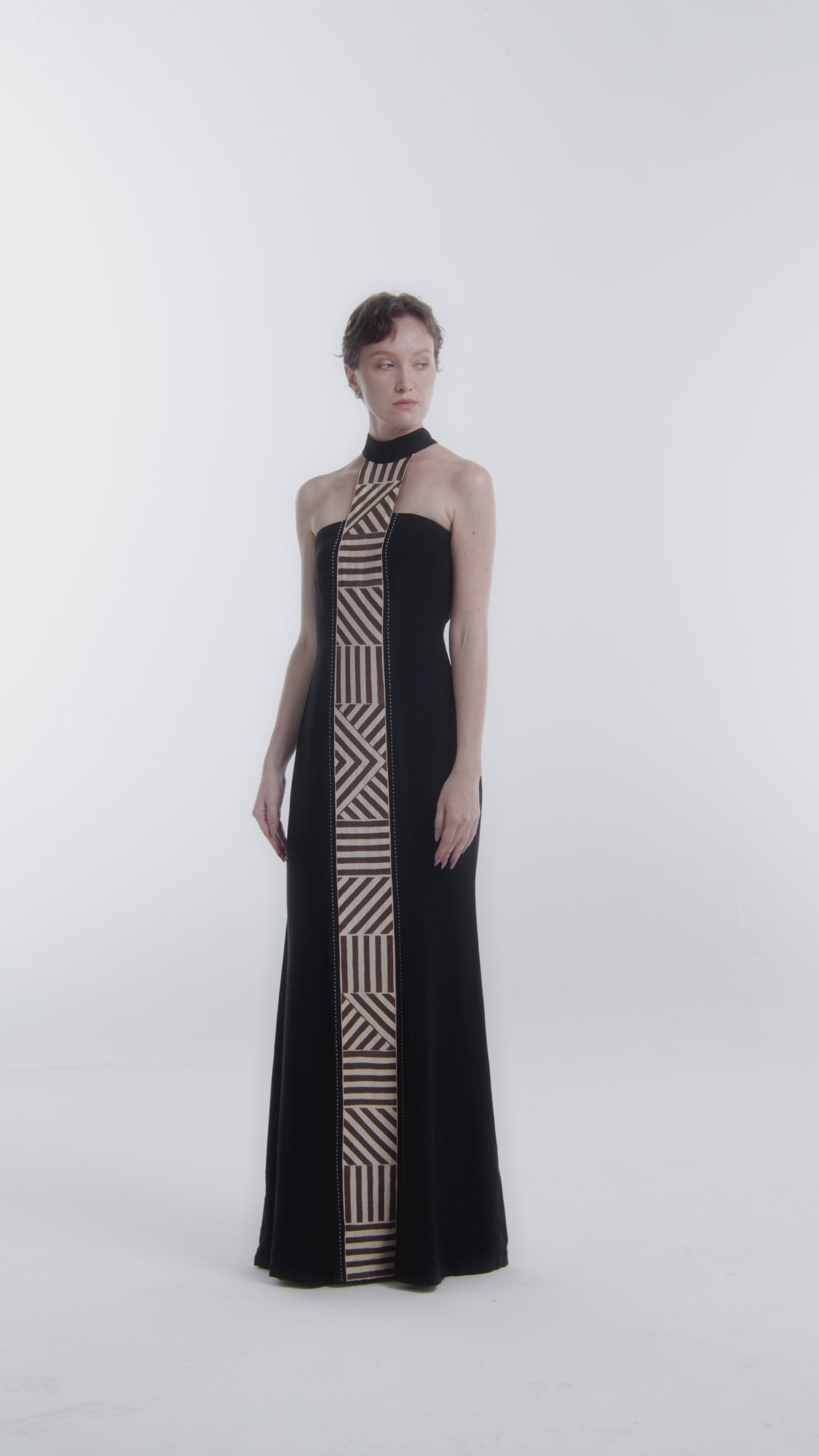 The dress's design is conceived to enhance this central work of art. The halter neckline draws the eye to the shoulders and neck, inviting it to follow the path of the geometries. Crafted from our Dui silk, the dress falls to the floor with an ethereal fluidity, creating a statuesque and unforgettable silhouette that moves with you.