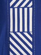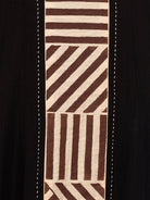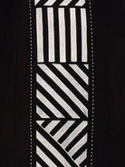The spectacular column of geometric shapes that runs down the dress is the result of a double artisanal ritual. First, our artists hand-stamp the patterns with wooden blocks, creating a base of color and shape. Next, our embroiderers trace the outline of each figure by hand, giving it a relief, light, and definition that make it vibrate.