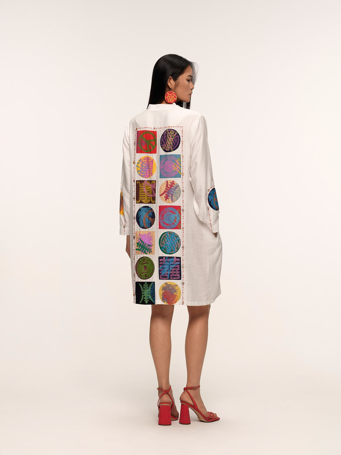 To add a final layer of definition and luxury, delicate hand embroidery runs across the back and sleeves, framing the artwork. All of this rests on our Dui fabric, a light and ethereal raw silk that allows the complexity of the design to breathe and flow with you, proving that craftsmanship can be both complex and lightweight.