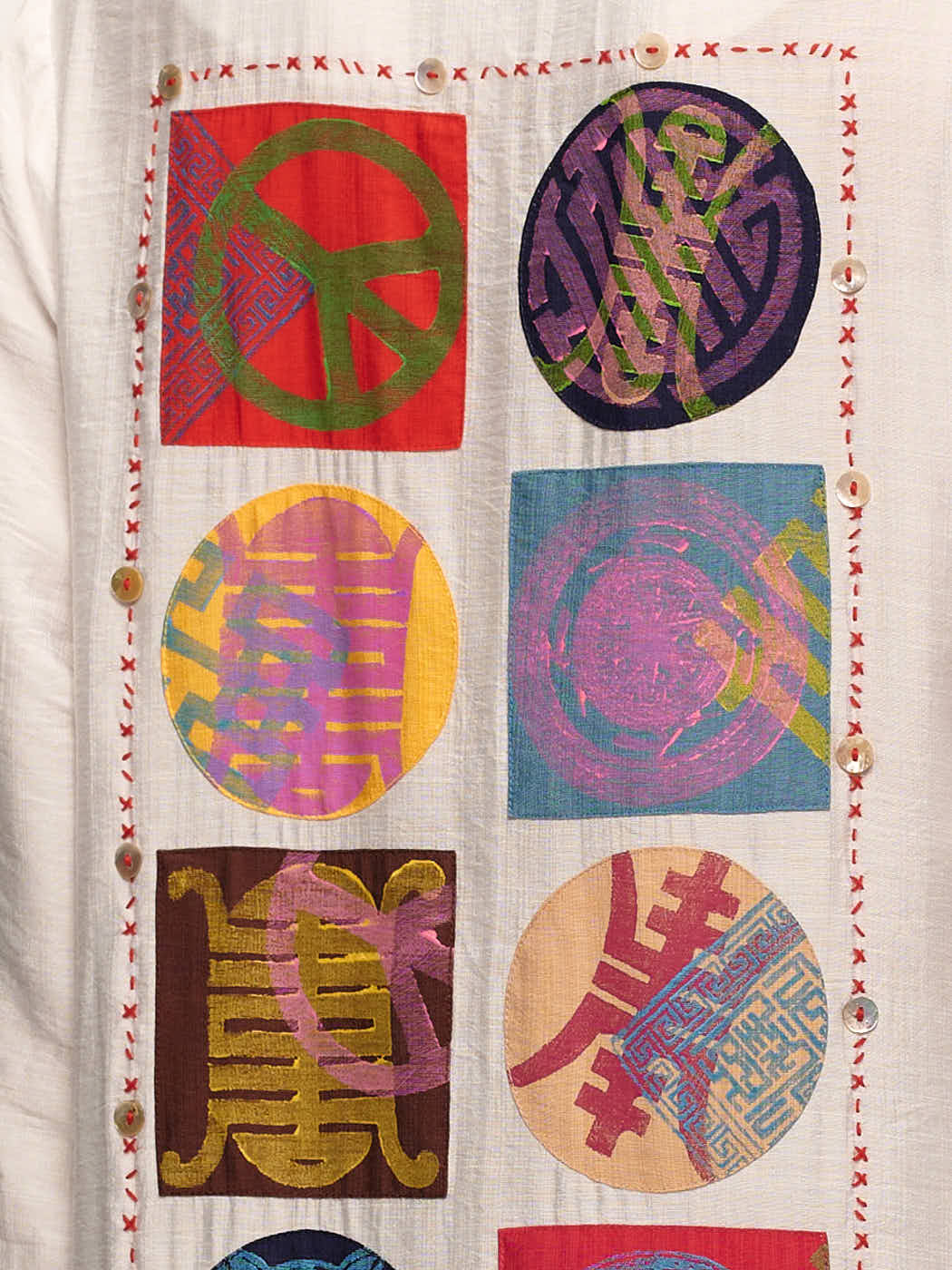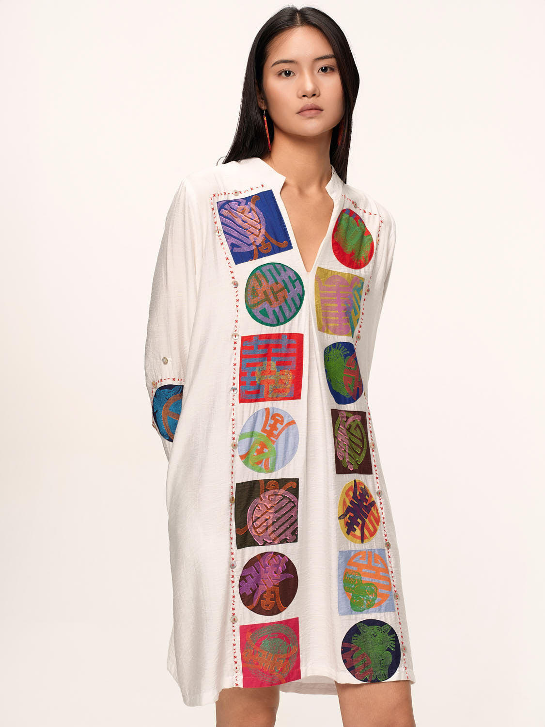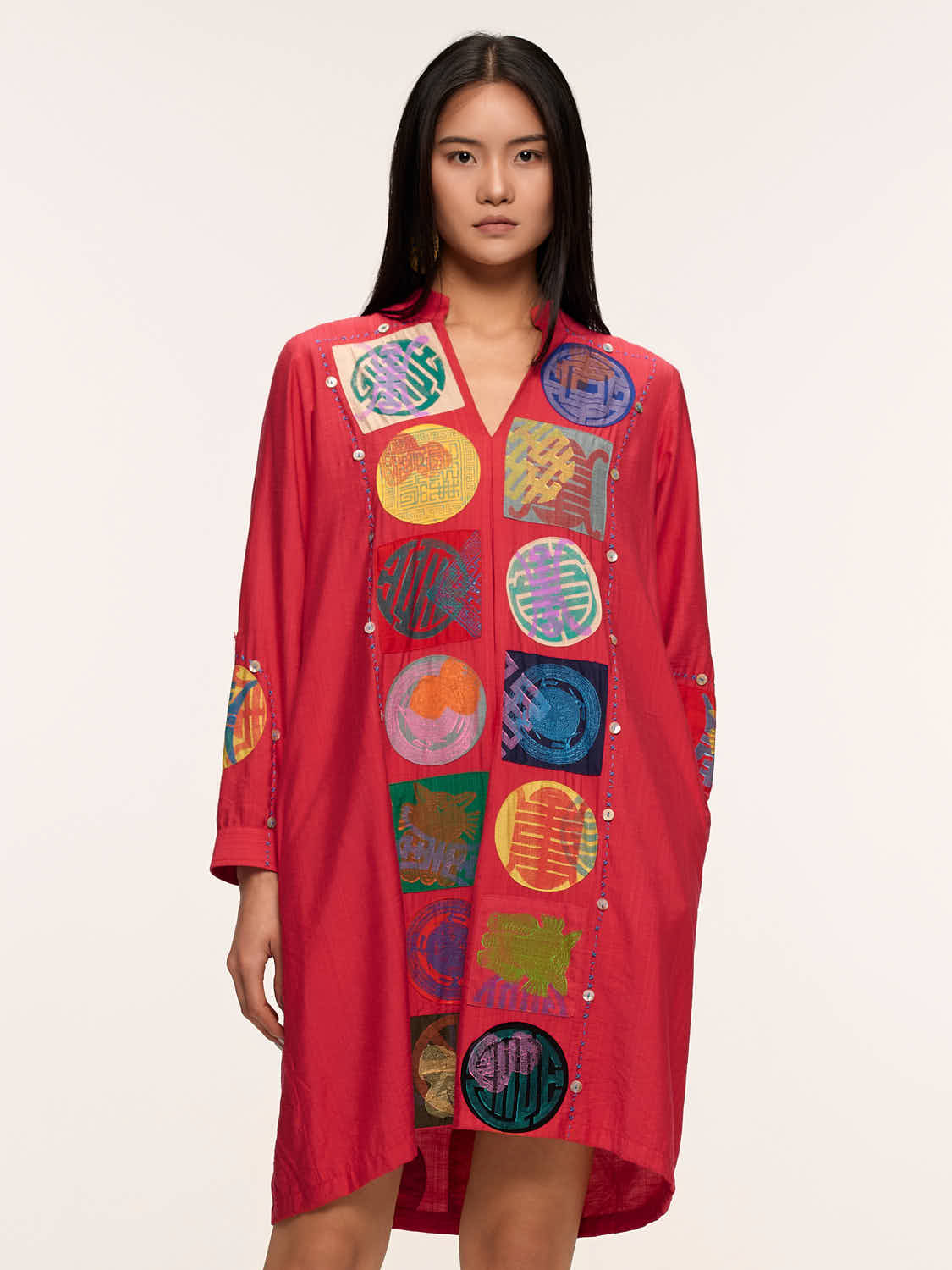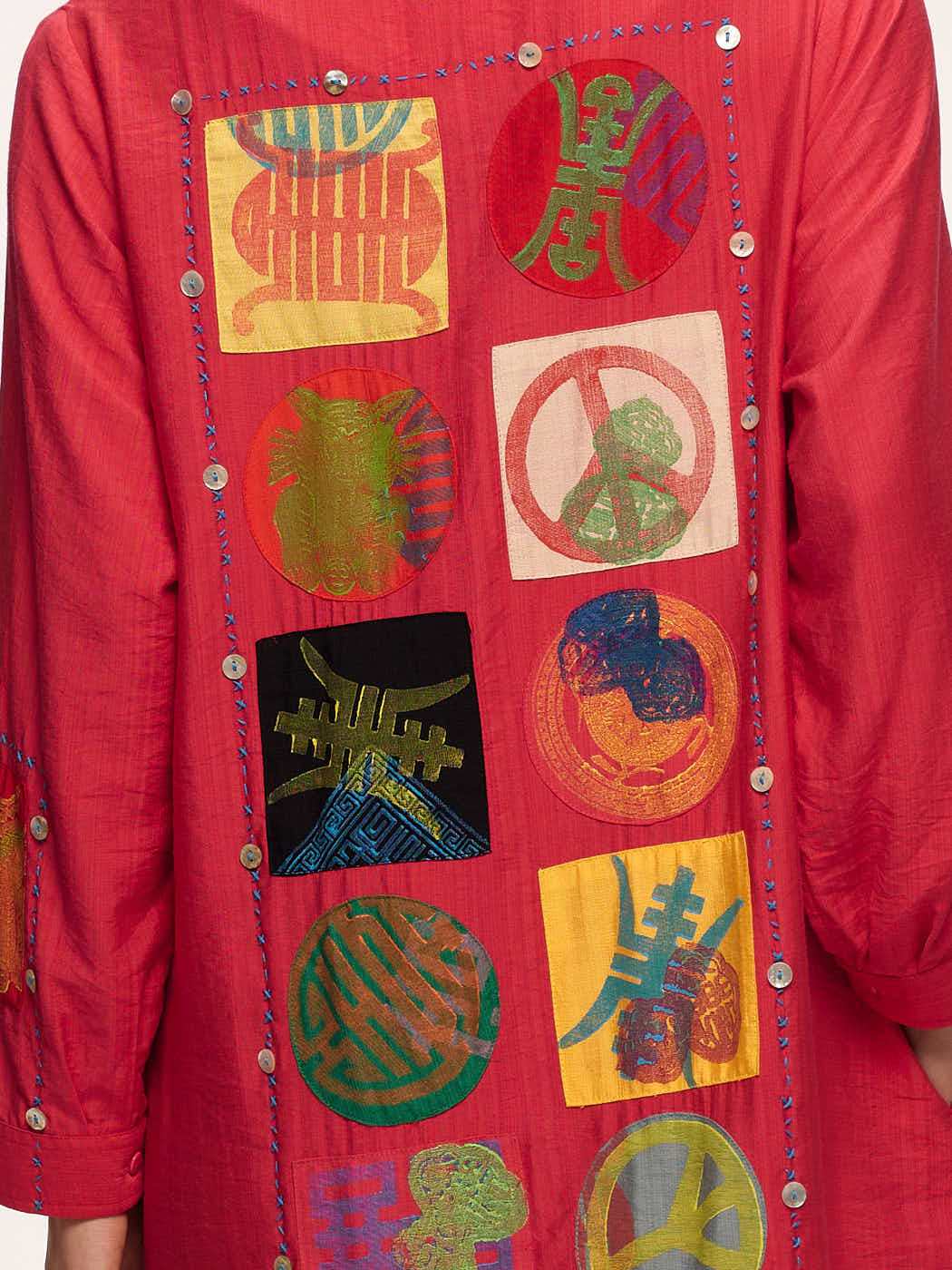 The heart of this dress is its unique process. First, our artisans create a vibrant base, a mosaic of hand-sewn patchwork. On this already richly textured canvas, they perform the second step: hand-printing traditional Vietnamese symbols with wooden blocks. This double layer creates a three-dimensional effect, where the symbols interact with the background colors in a whole new way.