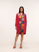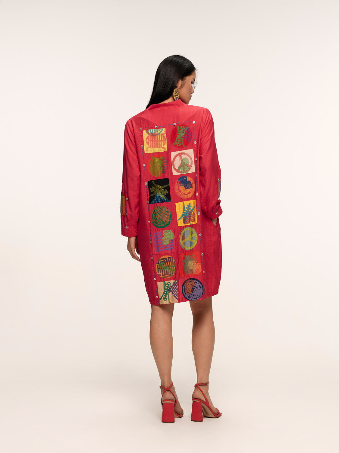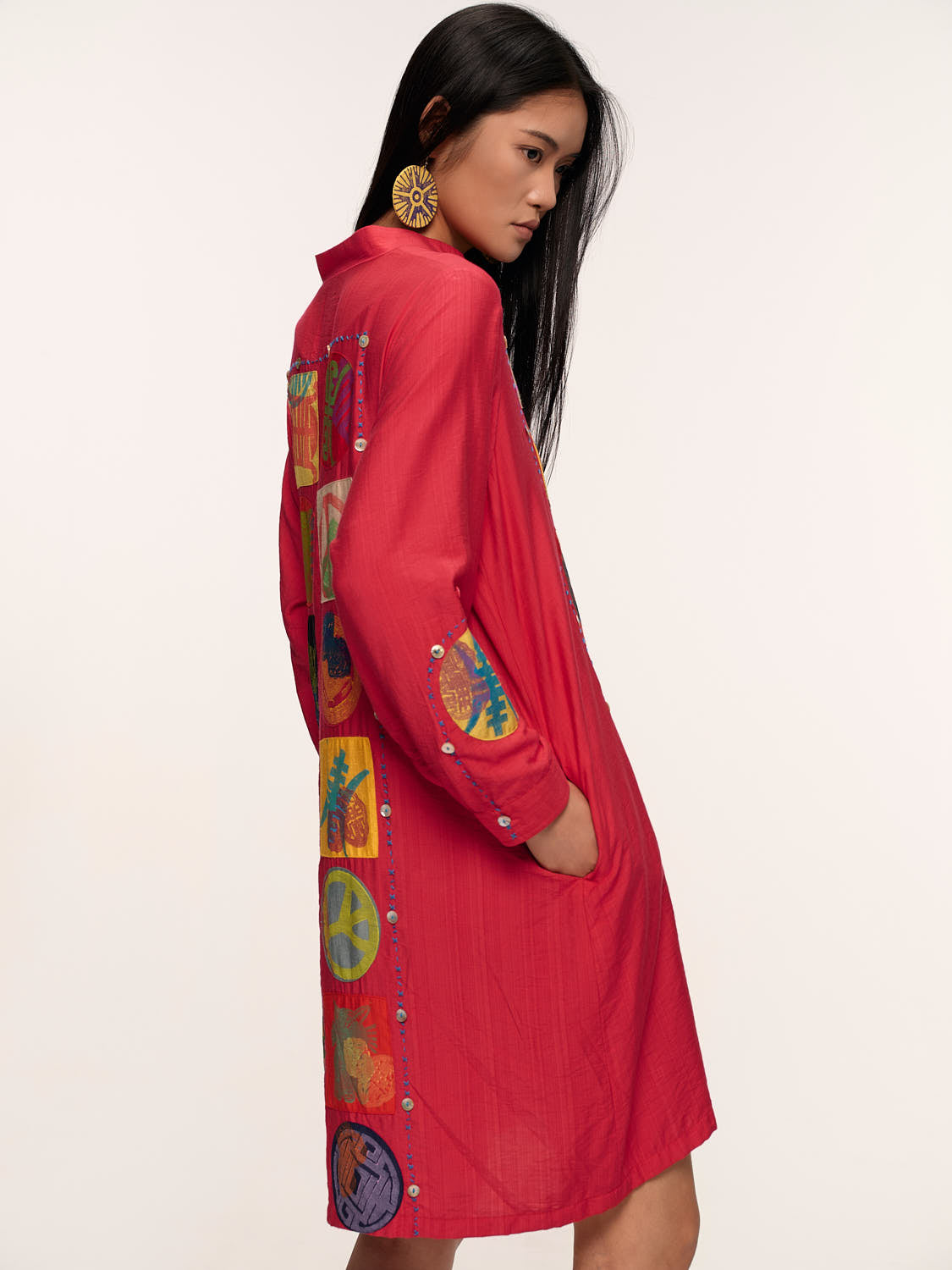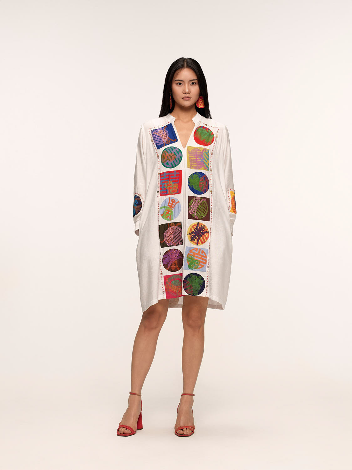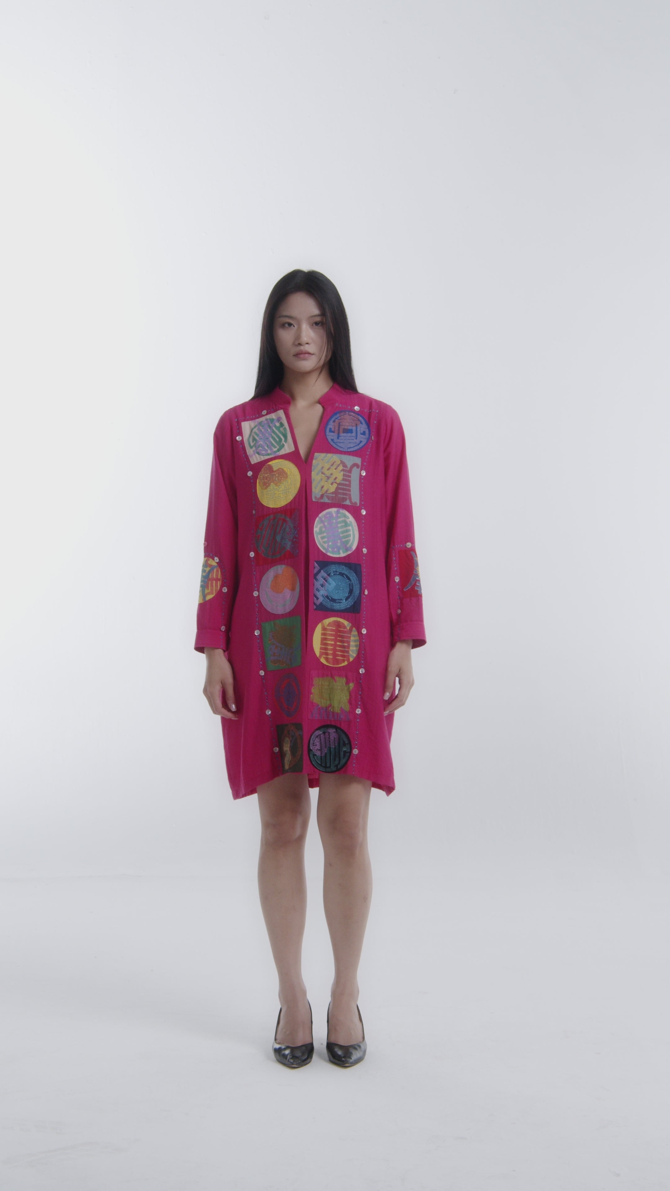 The heart of this dress is its unique process. First, our artisans create a vibrant base, a mosaic of hand-sewn patchwork. On this already richly textured canvas, they perform the second step: hand-printing traditional Vietnamese symbols with wooden blocks. This double layer creates a three-dimensional effect, where the symbols interact with the background colors in a whole new way.