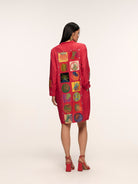 This dress is a study in layers, like memories that overlap to create a story. We didn't settle for just one technique; we created a colorful patchwork canvas and then added a second layer of art on top of it. The result is a piece of unique visual richness and depth.