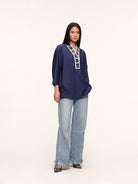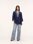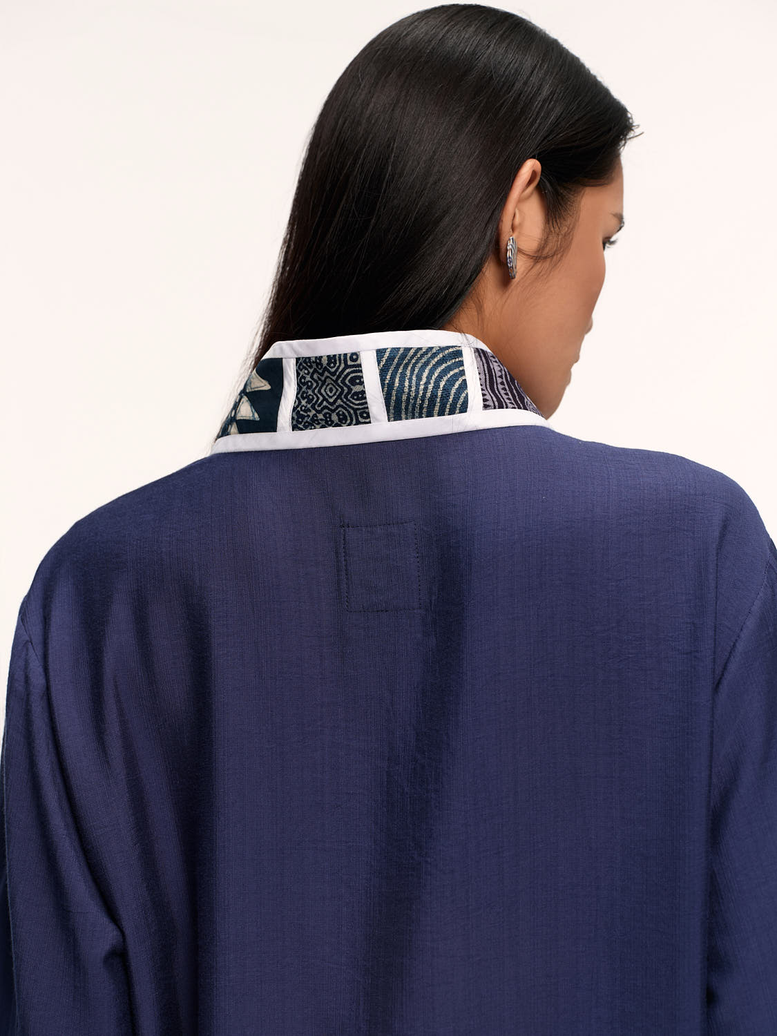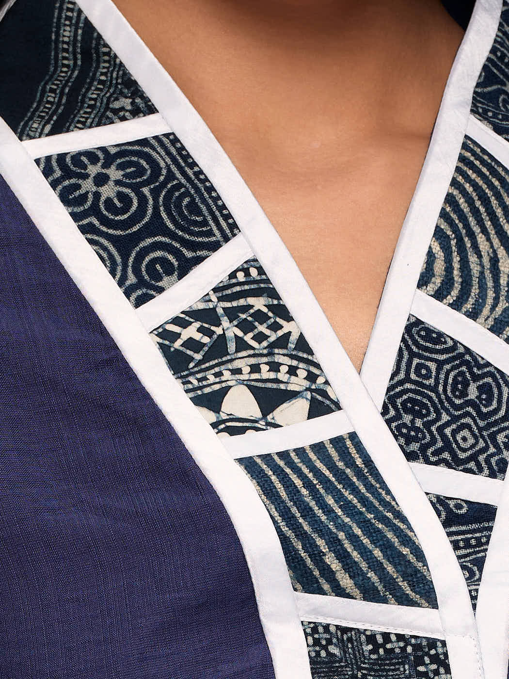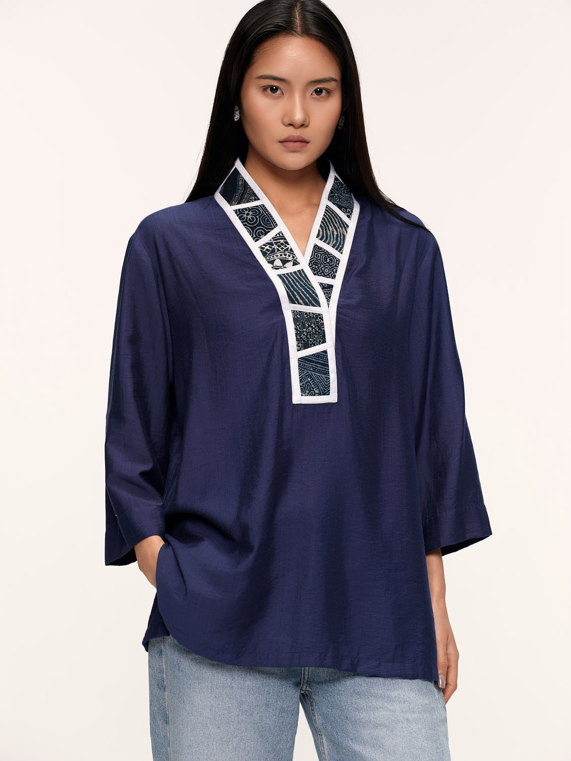 • Batik (v-neck): A traditional Vietnamese art form where patterns are drawn on fabric with wax using a bent copper pen, then dyed—often in deep indigo—and finally cleansed of wax in hot water revealing the painted design.