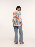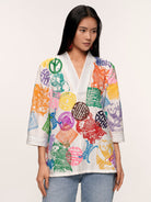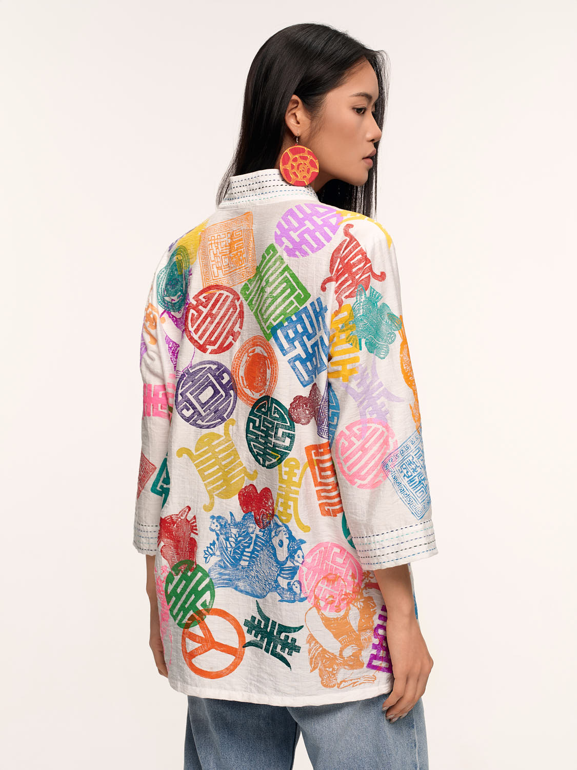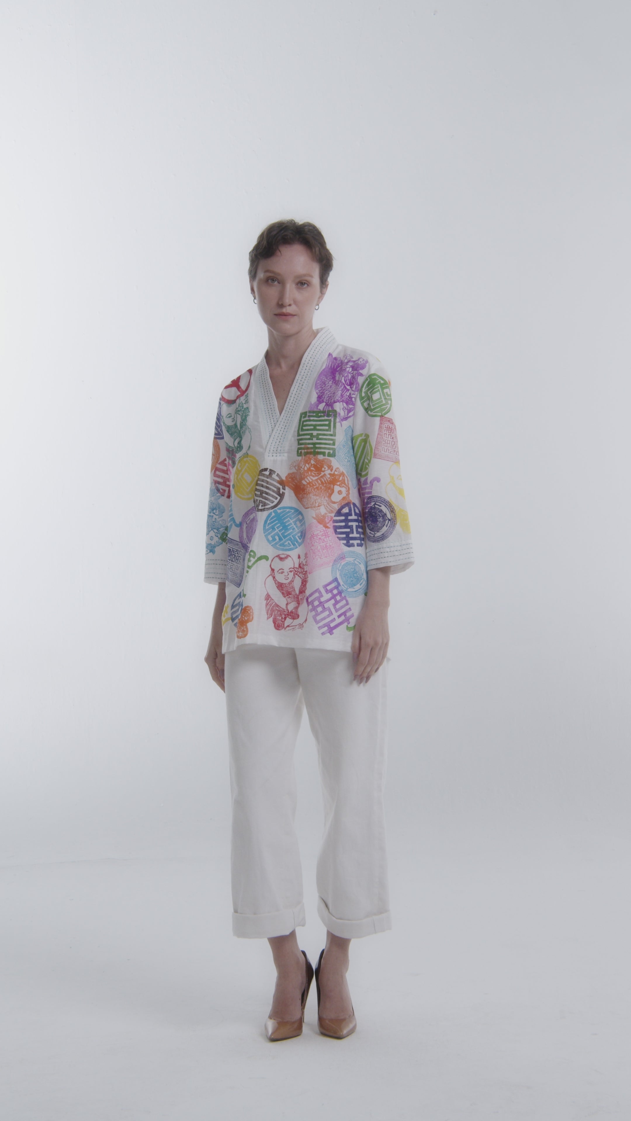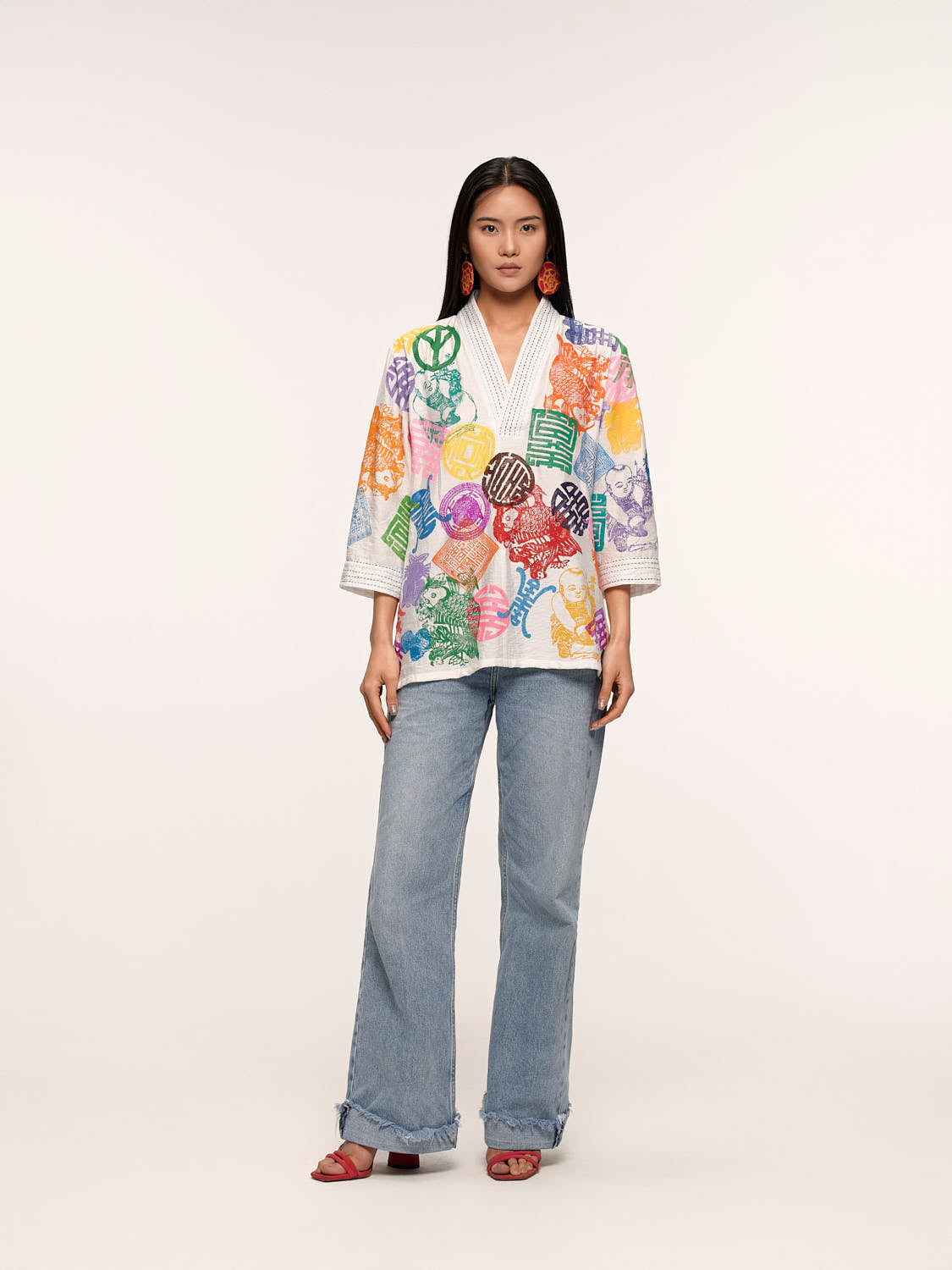 This blouse is a vibrant celebration of symbolism and color. Its design feels like an artistic collage, a creative “fever” where symbols of luck, peace, and mythology overlap in harmonious chaos. It is a garment that does not whisper, but sings, perfect for expressing a cheerful, art-loving personality.