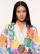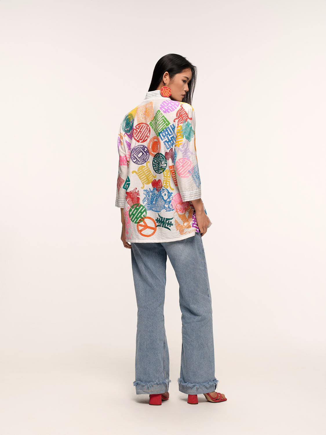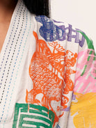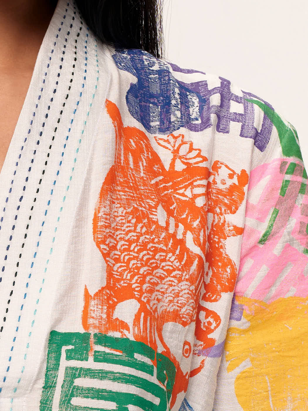 What makes this piece unique is its handcrafted print. Against an off-white canvas, a palette of vivid colors explodes: green, orange, red, blue, yellow, and pink. Each motif has been hand-printed with wooden blocks, mixing traditional Asian iconography, mythological creatures, and geometric patterns. The overlapping of these stamps creates incredible depth and makes every inch of the fabric tell a different story.
