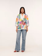 To frame this explosion of color, a subtle and elegant detail runs along the V-neckline and the cuffs of the three-quarter sleeves. This delicate hand-embroidered stitching adds a touch of refinement and a couture finish, demonstrating the care taken in every detail.