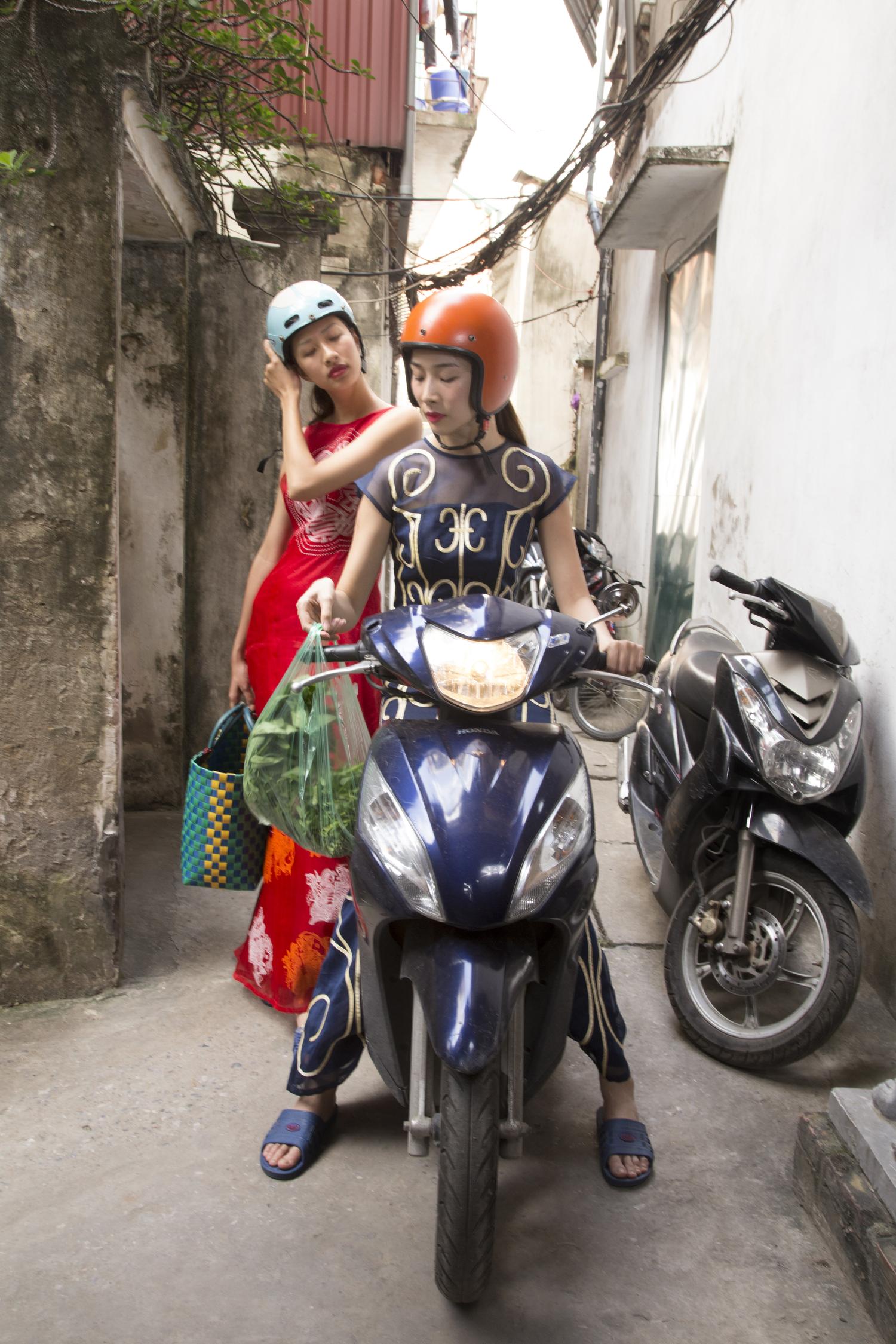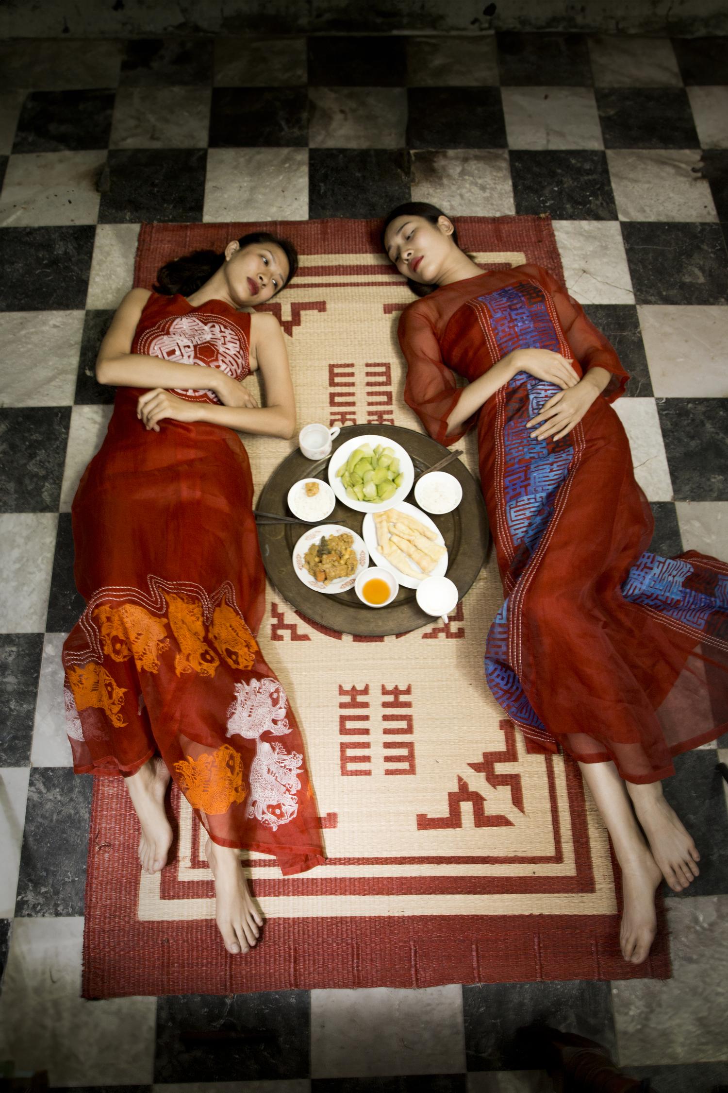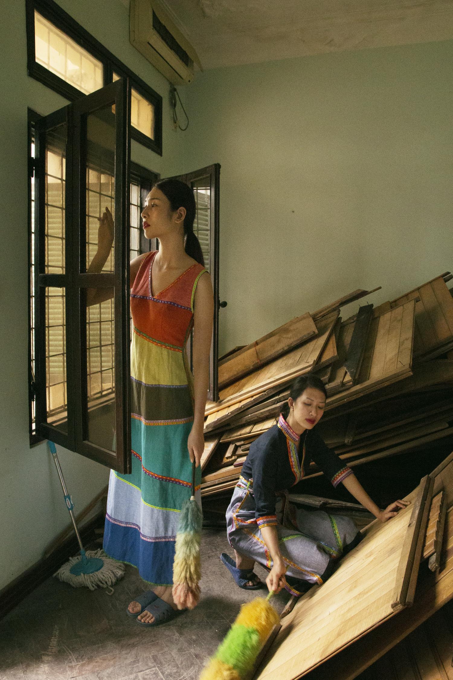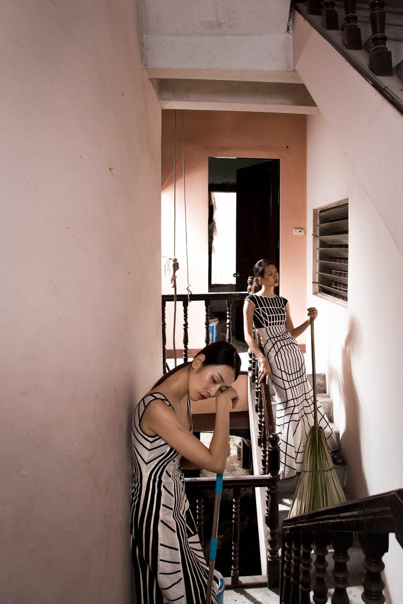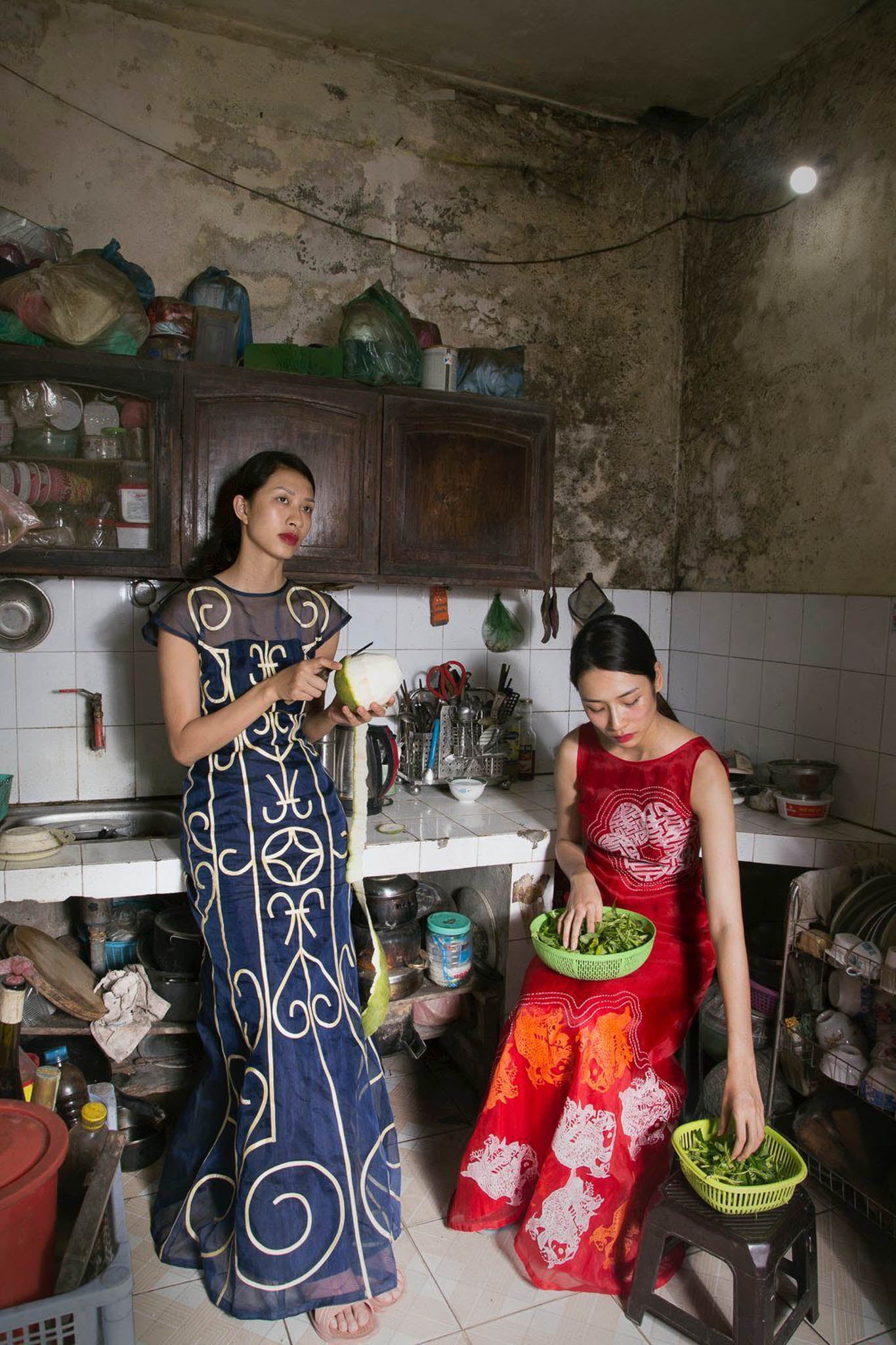 “I took inspiration from multiple occasions where I witnessed female relatives taking care of housework after family gatherings, while male relatives sat back and enjoyed themselves. This is an example of moments that manifest patriarchy and gender biases commonly seen across households in both cities and rural areas. I imagined women performing their tasks with acceptance and out of habit, but in glamorous and extravagant costumes to highlight the contrast and make it almost celebratory. With reference to the classic Cinderella tale where the restrictive home parallels the glamorous ball, I wanted to recreate the duality in a single scene. Reality is not black and white — are these women really oppressed or is it a faint, lingering remnant from a feudal society? In femininity, there is soft power, where things are not always what they seem to be. I purposefully chose my grandma’s kitchen, alongside the courtyard and interior of my parents’ house. An obvious reason was that the locations are domestic and familiar. Grandma’s kitchen was the one I was most proud of, as it’s full of memorabilia, even tracing back to wartime. It’s an interesting contrast to the designer dresses, as Diego also wittily took inspiration from the mundane things that exist in Vietnamese culture. It’s oddly satisfying to juxtapose the artworks (the dresses) with their own sources, like a simulation next to its origin.” - Lac Hoang