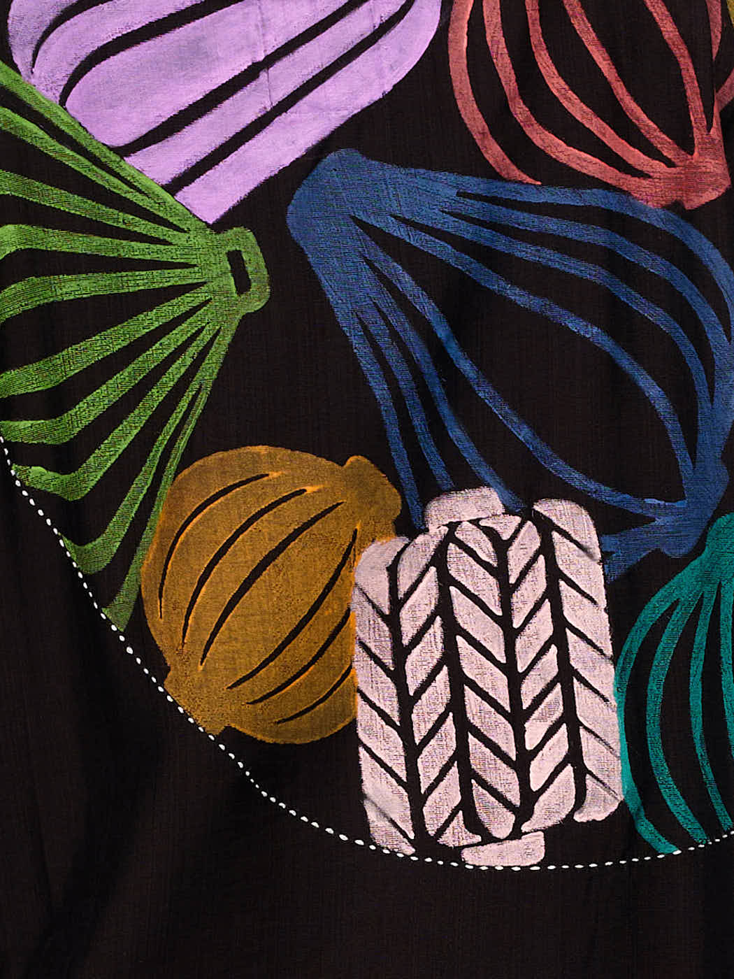 Each lantern is the result of meticulous double work. First, our artisans hand-stamp the color with wooden blocks, creating the luminous base. Then, our embroiderers draw the outline of each lantern with thread and needle, giving them a definition and relief that makes them almost float on the fabric.