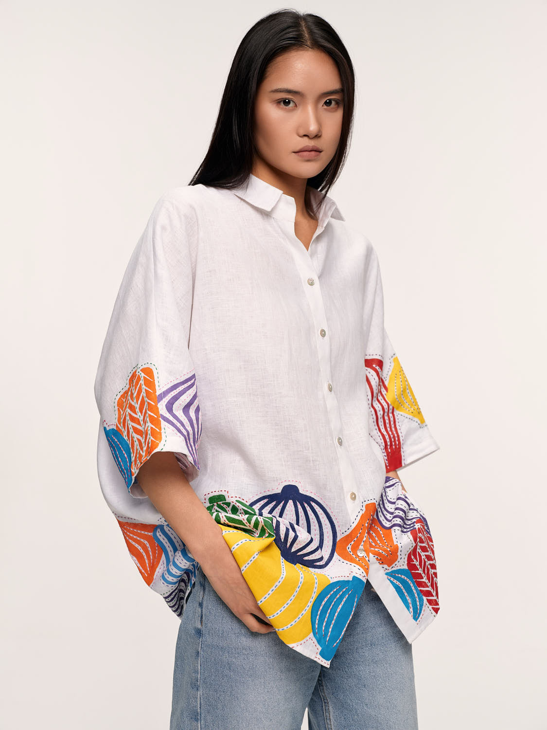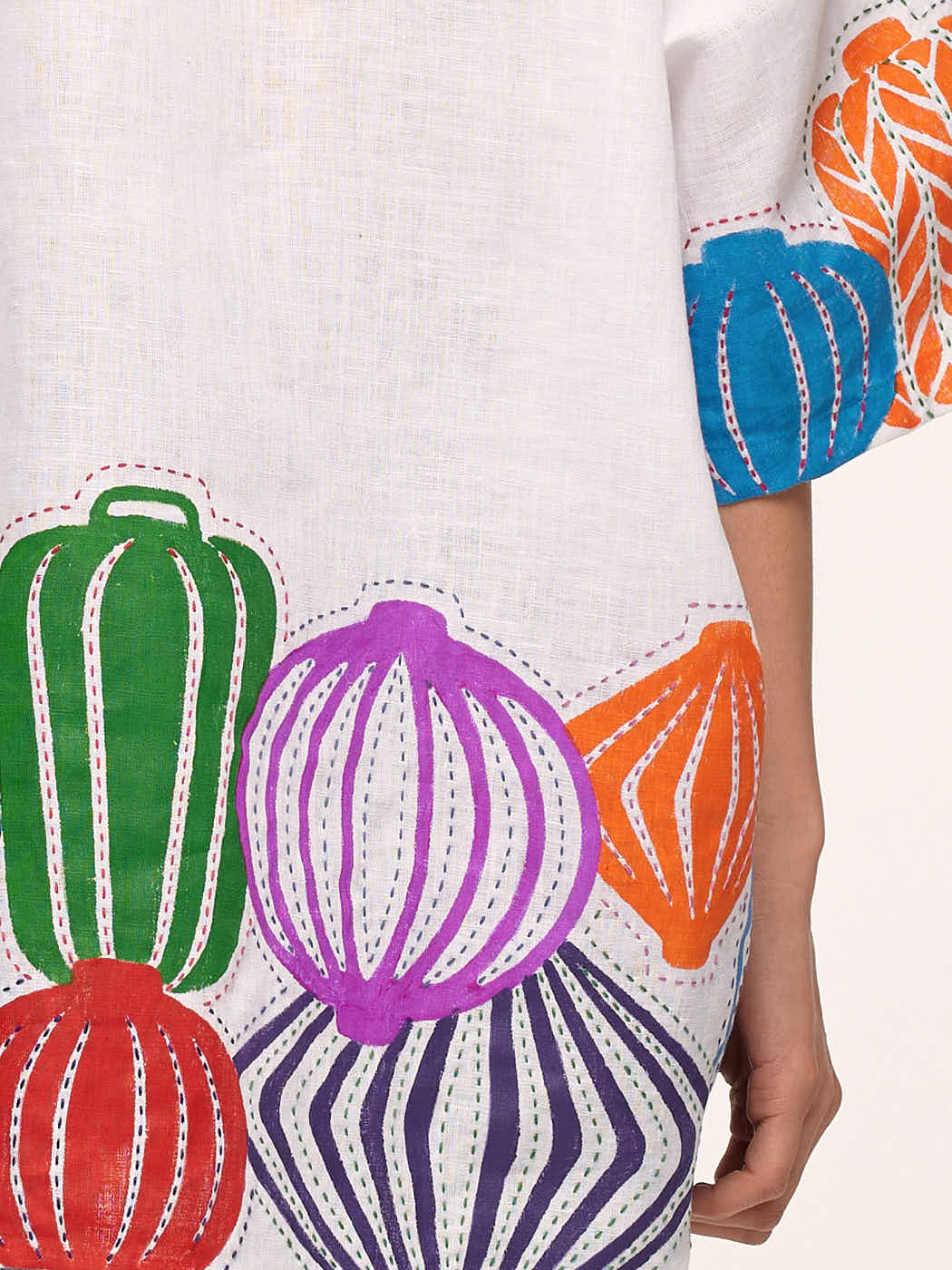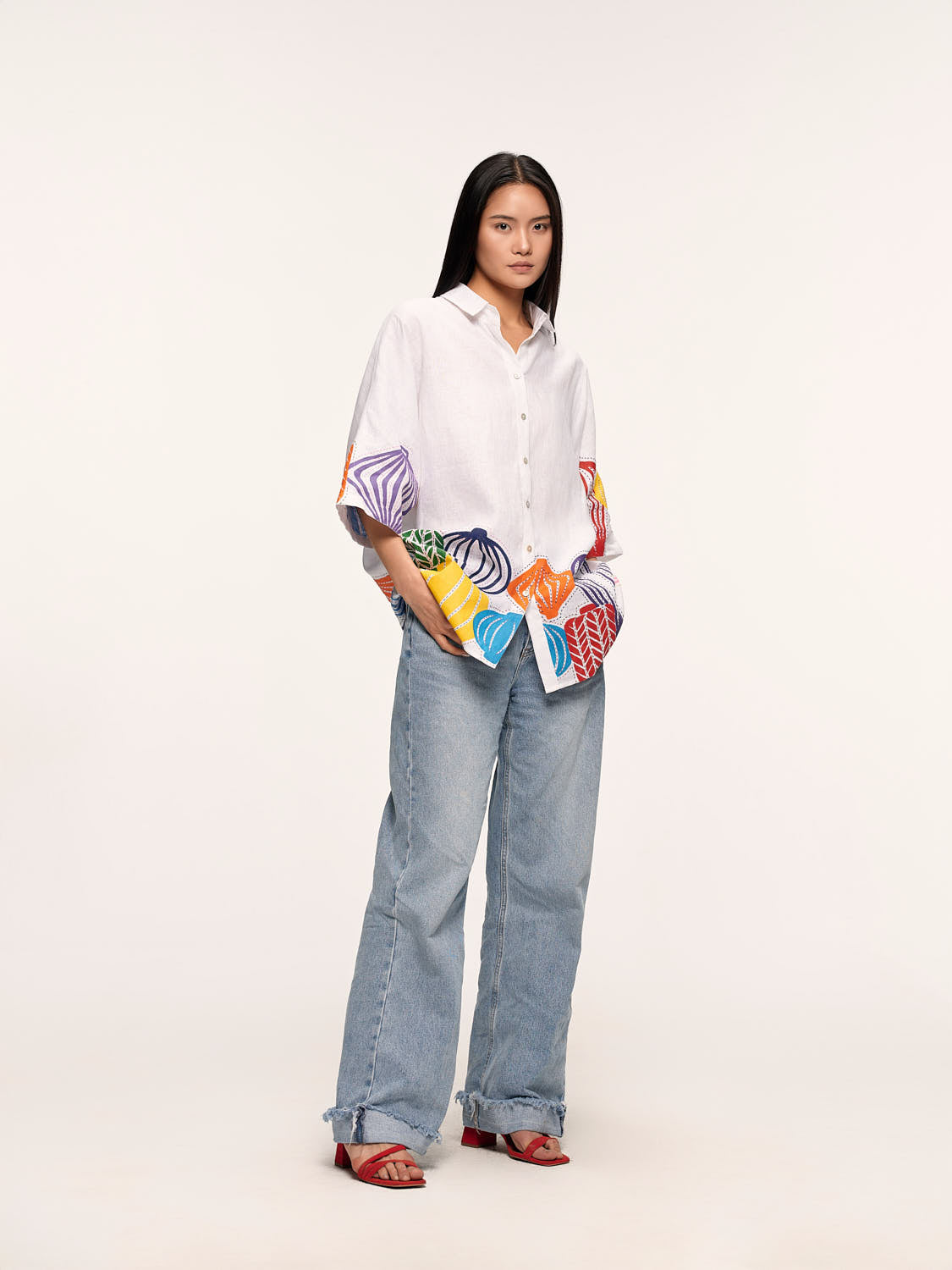 Linen is the perfect canvas for this story. Its natural texture and incredible lightness evoke the simplicity and beauty of Vietnamese craftsmanship. Its one-size-fits-all cut creates a fluid and relaxed silhouette, as comfortable and elegant as a stroll along the banks of the Thu Bồn River under the light of the lanterns.